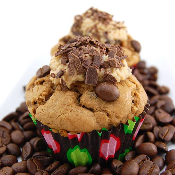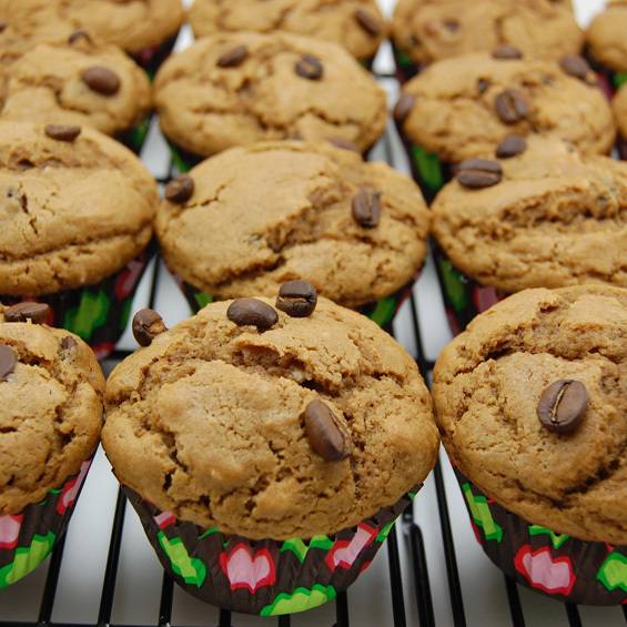 Загрејте ја рерната на 190° C. Подгответе 12 хартиени калапчиња за колачи. Ставете го путерот во тавче и полека мешајте го на ниска температура додека се стопи. Потоа, тргнете го од ринглата и оставете го малку да се олади. Во меѓувреме, во длабок сад сипете ги брашното и шеќерот. Во друг сад ставете го јајцето, млекото и еспресото во прав и мешајте со лажица додека кафето се изедначи. Подготвената кафе-смеса додадете ја во садот кај што се брашното и шеќерот, а потоа и стопениот путер. Мешајте додека се соединат состојките. Потоа, додадете ги чоколадните парченца и повторно промешајте, но кратко. Кога ќе завршите со изедначувањето на смесата, поделете ја на еднакви колачиња во форма на бомбици. Декорирајте ги со зрна од кафе и ставете ги да се печат 15-20 минути. Можете да се уверите дека се готови кога со чепкалка за заби ќе боцнете едно колаче и таа глатко ќе помине низ него. Извадете ги колачите од рерна и оставете ги 5 минути да се оладат.