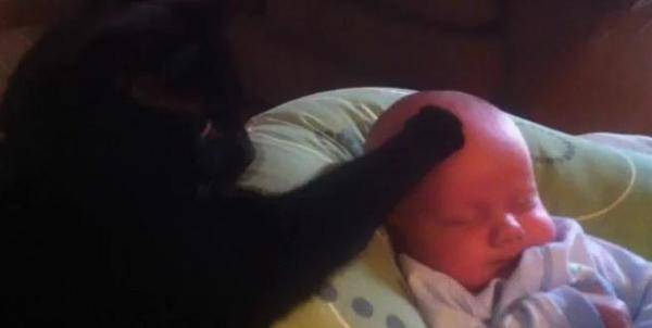 Погледнете каков смирувачки ефект има нежниот допир на ова маче. Го чува бебето подобро и од дадилка.