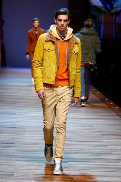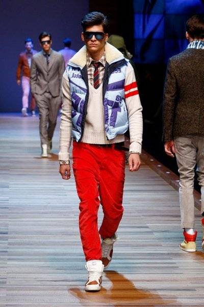 Прави впечаток тоа што панталоните се поширики во горниот дел, отколку во долниот, тенденција што се забележува во колекциите на повеќе дизајнери. Има јасен контраст меѓу таа кројка и доста прибраните и исчистени како силуета џемпери, сакоа и вратоврски.