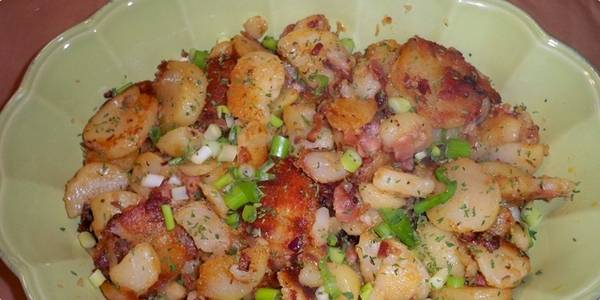Во голем сад ставете ги сварените компири, сланината, пиперката, црвениот кромид и младото кромидче.