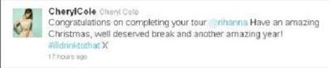 Шерил била сместена во ВИП ложата во Лондон, каде Ријана имала концерт, а откако завршил концертот, Кол веднаш се огласила на својот Твитер: