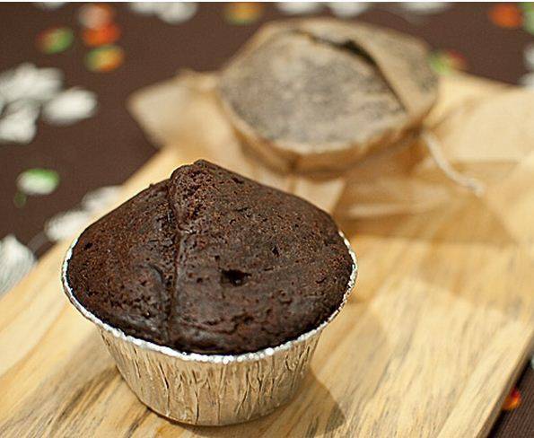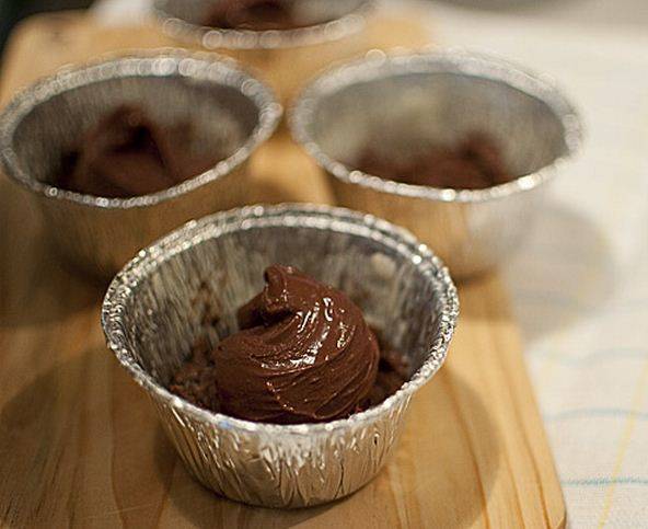 Намачкајте со маргарин 4 зделички од по 150 ml и ставете по една лажица од тестото на дното. Ставете по една полна лажичка од филот во средина, па дополнете ги со тестото. Израмнете го тестото и поклопете ги зделите со мрсна хартија со фалта во средината, за да има простор тестото да нарасне. врзете ја хартијата.