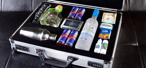 Отворете ја оваа актовка и наместо да се замарате со неважни работи, овде ќе најдете се што ви треба за да се чувствувате спремни за било каде J. Содржината вклучува 17 “алуминиумска актовка, 1 пар лисици со 2 копчиња, изгравирана плоча, персонализирана со 2 линии текст, 375 мл Patron Текила, 375 мл Grey Goose Водка, 10 Advil таблети, 24 таблети за џвакање зо дополнителна сила, 4 шотови од 2 мл Red Bull, 0,37 мл конзерва Altoids, 0,5 мл на Bausch & Lomb капки за очи, отварач за вино, 1 шпил карти, 5 коцки, 350 мл Мартини шејкер и 4 чашки за шотови.
