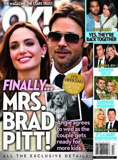 Американското списание „ОК“ на својата насловна страна објавило слика на која се претставени Pitt и Jolie заедно со наслов дека наскоро ќе се венчаат. Другата шокантна вест што ја открива списанието е дека на есен парот ќе добие близнаци и дека на преслабата Angelina ова не ѝ претставувало никаков проблем.