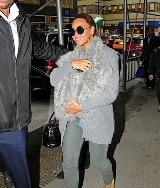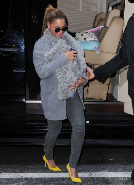 Пејачката носела жолти потпетици во комбинација со сиви фармерки и сив џемпер. Таа нормално претпоставувала дека ќе биде забележана од фотографите, па со соодветна гардероба ја прекрила малата Ivy Blue.