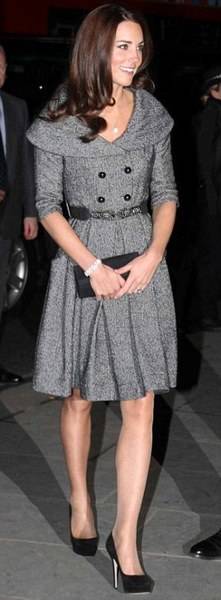 Во сив капут, црни високи потпетици и со блескав поглед, Кејт ги приковала очите на сите присутни врз себе. Ова е прв пат војвотката да се појави сама без принцот Вилијам во јавност, но очигледно досега одлично си ги совладала лекциите за кралското однесување.