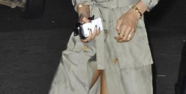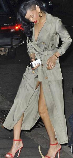 Забележана е како влегува во еден ресторан носејќи само мантил под кој од фотките на папараците се гледа дека Rihanna најверојатно не носи ништо. Ветарот дополнително им помогнал на папараците да ги видат голите нозе. Деколтето е посебна приказна која е уште еден доказ дека Rihanna не носи ништо под летниот мантил.