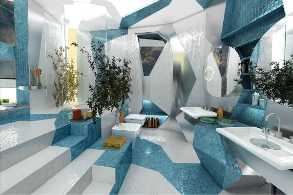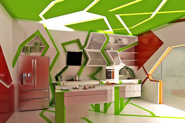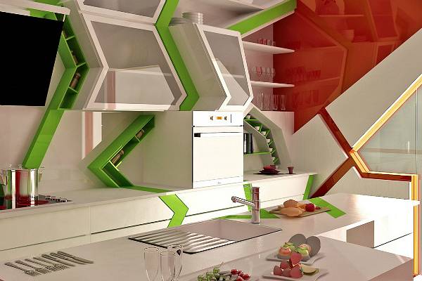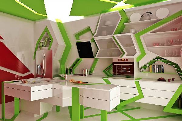 Ентериерот во духот на кубизмот е идеален за забава, што докажува и „ дивата “ кујна која со својот изглед потсетува на диско клуб со зелени ласерски снопови. Комбинацијата од агли, линии и бои често го оттргнува вниманието од реалните размери, овозможувајќи неопходен комфор дури и во најмалите простории.