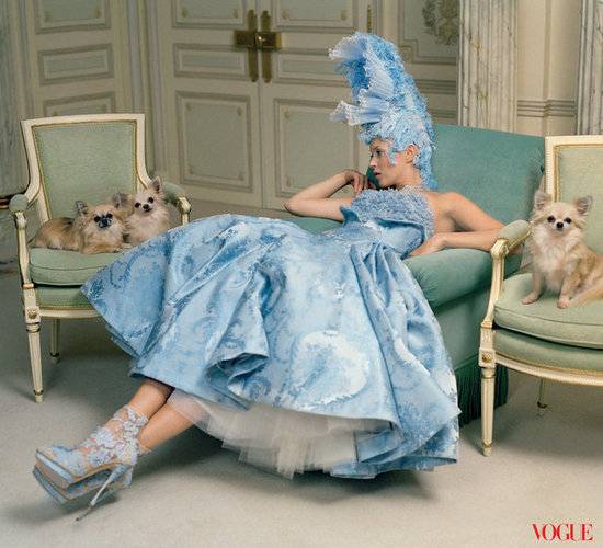 Најчесто ќе ја забележиме во фармерки и маичка или топлес, со многу накит на себе, а сега Kate Moss не изненади во вистинска смисла на зборот. За априлското издание на списанието „Vogue“, таа се облекла во стилот на Maria Antoaneta.