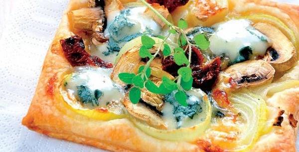 Посипете ја работната површина со брашно и на неа развлечете ја кората од лиснато тесто. Ставете ја кората во подмачкан плех и премачкајте ја со крем сирот. Одозгора посипете ја со пармезан. Исечете ги тиквиците и кромидот на тркалца, пршутата на коцки, па ставете ги одозгора. Изматете ги јајцата со неутралната павлака и прелијте го тестото. Зачибете по желба и ставете го ренданиот кашкавал и горгонзола. Ставете ја тавата во рерна на 180 степени и печете 45 минути.
