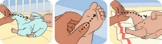 Пред да започнете затоплете ги рацете и нанесете неколку капки бадемово масло на рацете и протријте. Се започнува од стопалата кон бедрата на детето. Меко и бавно движете го палецот од петата кон прстите. После тоа преминете по должината на нозете од долу кон горе за да се подобри циркулацијата.