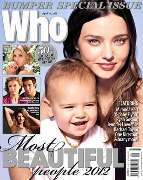 Списанието „Who“ ја прогласи манекенката Miranda Kerr за најубава личност во 2012 година и поради таа титула манекенката позирала за насловната страница на списанието заедно со преслаткото синче по име Flynn.