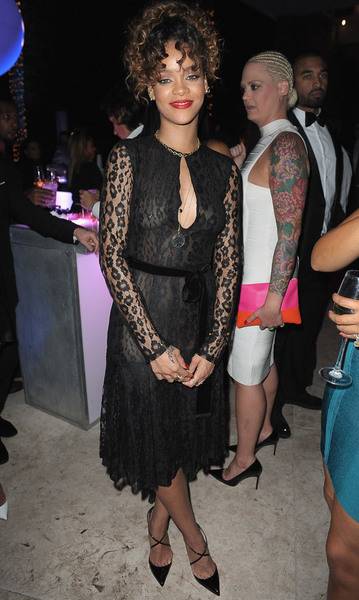 Rihanna пак Новата година ја дочека на приватна забава кај P.Diddy во Мајами, облечена во црн фустан од тантела кој ги покажува нејзините гради и задолжително, пирсот на брадавицата. Rihanna, иако е прекрасна, навистина замара со своите сексуални провокации. Со лошата фризура и невкусниот избор на чевли, прекрасниот фустан е ставен во втор план.