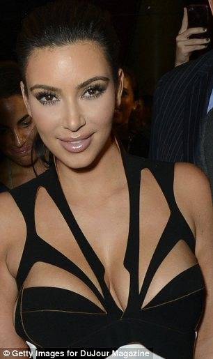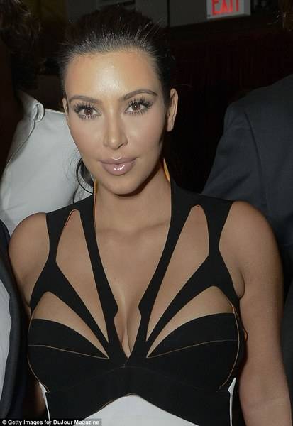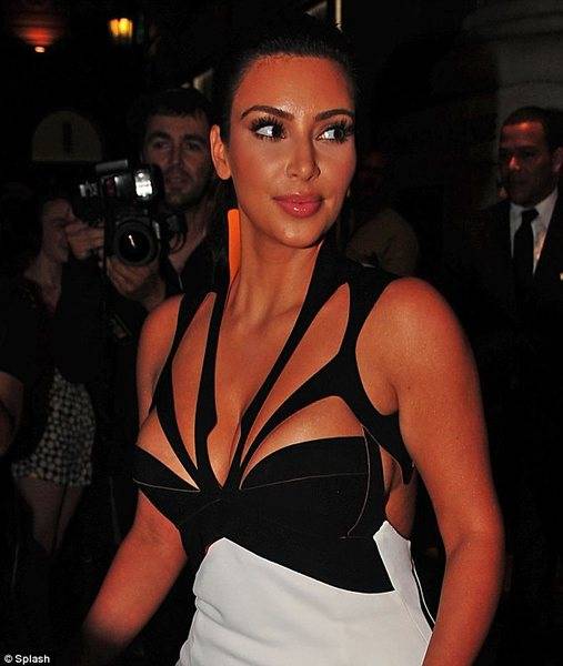 Ким се појави во црно-бел фустан со длабоки процепи на градите. Линијата на фустанот ги прати облините на Ким, длабок отвор до дното на грбот, и деколте кое многу открива.