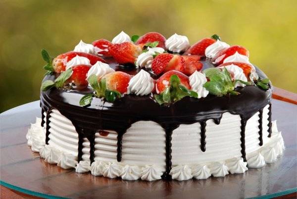 За глазурата растопете го путерот во кој ќе ја ставите чоколадата за готвење, мешајте на тивок оган додека да се растопи. Подгответе го шлагот и премачкајте ја кората. Одозгора прелијте со изладената глазура и декорирајте со јагоди и шлаг.