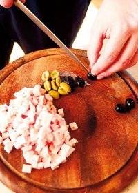 Шунката исечкајте ја шунката на коцки, а маслинките исчистете ги од семките и исечкајте ги на половина. Тестото излијте го на плех за печење обложен со хартија за печење. Врз него наредете ги шунката, маслинките, преостанатиот кашкавал и пицата ставете ја загреана рерна на 200 степени Целзиусови и печете 20 минути.