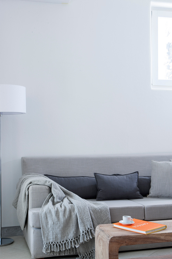 Внатрешноста на вилата е уредена со минималистички стил, едноставни материјали и линија на мебелот. Ништо не отскокнува од границите на нормала. Доминира белата боја, која е одлично ископонирана со сивата и кафената боја. Погледнете како изгледа приватната вила во Санторини.