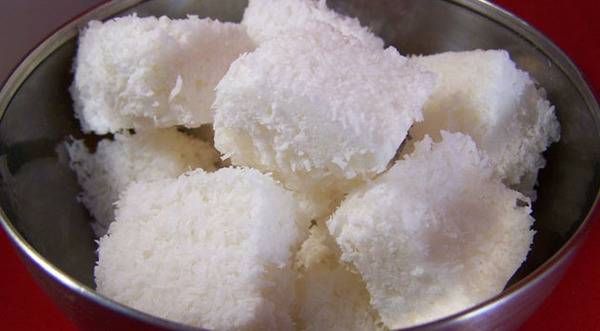 Поставете ги шеќерот и водата во тенџере. Штом ќе зоврие додадете го кокосовото брашно и варете уште 10 мин на умерен оган мешајќи постојано. Исипете ја половината од готовата смеса врз сув затоплен лист алуминиумска фолија и направете слој со дебелина од 4-5 мм. Во останатиот дел додадете малку од бојата, измешајте и додадете врз белиот слој од горе. Измазнете со лажица. Пред да се олади сосема исечете на мали квадратчиња. Со оваа смеса може да се украси и торта. Розово обоена врз бел крем, а бела врз чоколаден.