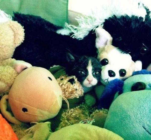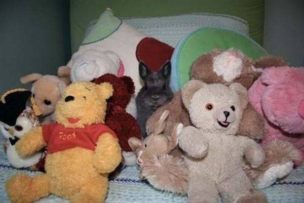 Ова се неколку фотографии во кои помеѓу купот плишани и крзнени играчки и предмети се наоѓа по едно преслатко животинче. Совршена идеја и вие да направите некоја ваква фотографија доколку имате милениче 🙂