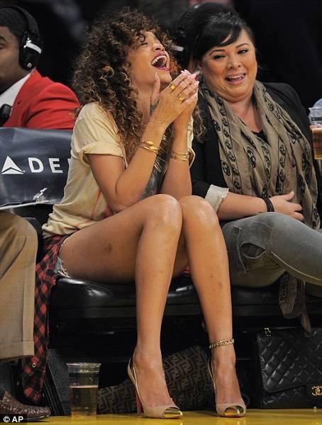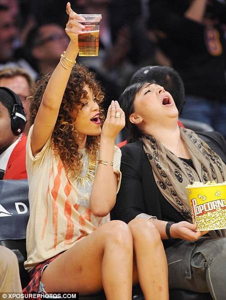 Иако седела во првиот ред, 23-годишната пејачка изгледала незаинтересирана за мечот на Лејкерси кој се одржал во „Стејпл центарот“ во Лос Анџелес. На мечот дошла со една пријателка и цело време не можеле да се соземат од смеење.