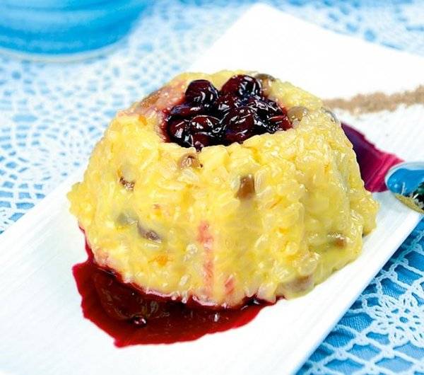 Исцедете го сокот од портокалите и изрендајте малку кора од портокал. Во оваа смеса варете го оризот и шеќерот. Кога ќе се излади малку ставете го сувото грозје. По желба може да ставите и бадеми или ореви. Ставете ја смесата во чинија да се стегне и да се обликува. Вишните сварете ги со малку шеќер и густин. Со нив прелијте го сутлијашот.