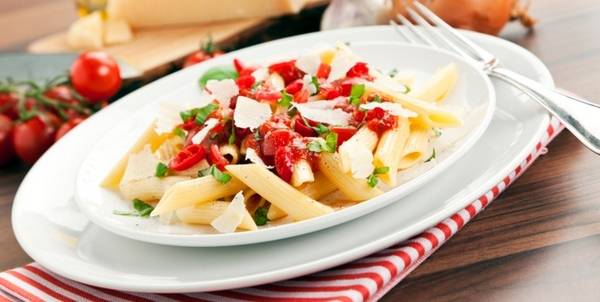 Ставете го ситно исецканиот лук на загреано масло. Нека се пропржи малку и потоа додајте ги тестенините. Сипете го виното и зачинете. Потоа додајте половина од количината супа и варете ги на тивок оган. Варете ги во покриен сад. Потоа додајте ја и преостанатата количина на супа. Кога тестенините ќе бидат сварени ставете и исецкани домати, маслинки и тиквички. Уште малку пропржете на тивок оган и јадењето е готово. На крајот ставете го изренданиот кашкавал.