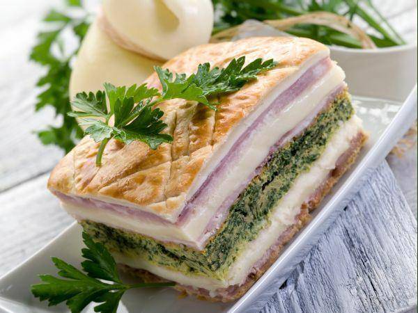Кога ќе се олади питата можете да се сервирате исечена на коцки и украсете со преостанатата шунка.