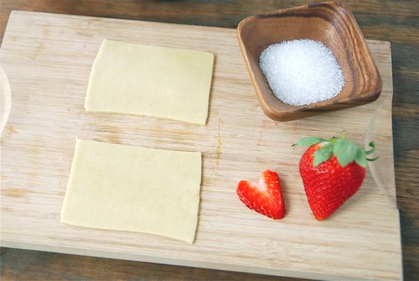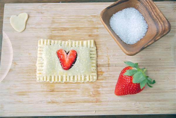 На крај, ставете тенко сечено парче јаготка и соединете го правоаголникот со смесата и правоаголникот со отсеченото срце, така што јаготката убаво ќе го пополни просторот. Убаво премачкајте ги правоаголничињата со жолчка од јајца и посипете ги со шеќер…