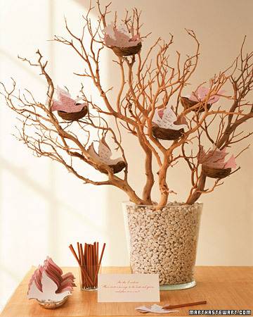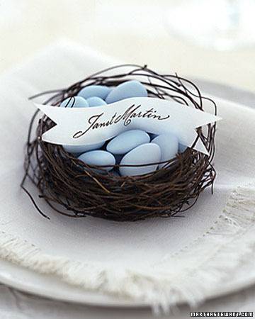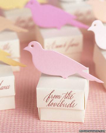Направете го менито со цртежи или фотографии со птици, вашата торта украсете ја со две заљубени птици на врвот, украсете ја косата со минијатурни шнолички во форма на птици, вашите покани и бомбончињата исто така може да бидат украсени со птици, исто како и вашите централни буќети. Погледнете како може да изгледа тоа: