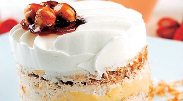 Изматете чврст снег од осум белки и додадете 70гр брашно. Изматете шест жолчки со 180гр шеќер, додадете ги мелените бадеми и во тоа измешајте го снегот од белките. Печете во подмачкан и со брашно наросен калап околу 40 минути на 180 степени. Печената торта извадете ја од калапот, оладете ја и пресечете ја на половина. За филот изматете 10 жолчки со преостанатиот шеќер, па додадете им го останатото брашно, шеќерот од ванила и децилитар ладно млеко. Матете додаке да добиете крем без грудвички, а останатото млеко оставете го да проврие. Во топлото млеко измешајте ги припремените жолчки и варете се додека филот не се згусне. Посебно изматете го маргаринот и додадете го во оладениот фил. Филувајте ги корите, целата торта, премачкајте и однадвор, па наросете со сецканите бадеми.