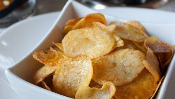 Подготовка: Компирите излупете ги и исечете ги многу тенко. Ставете ги во голем сад и прелијте ги со ладна вода. Оставете ги да отстојат 1 час.Рерната загрејте ја 230 целзиусови степени. Исцедете ја водата од компирите и со кујнска крпа убаво избришете ги за да не бидат ни малку влажни. Земете едно тавче и обложете го со хартија за печење. Наредете ги компирите во еден слој, никако да бидат преклопени. Попрскајте ги со малку масло и ставете ги да се печат во загреаната рерна, околу 15 минити, додека да бидат поруменети и крцкави. Откако ќе ги извадите ќе ги прелеете со оцетот и солта.