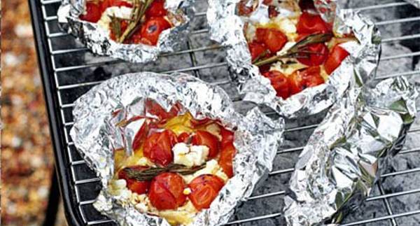 Разделете ги рамномерно чери доматите и фета сирењето врз шесте дупли фолии. Зачинете со гранчиња рузмарин и маслиново масло.