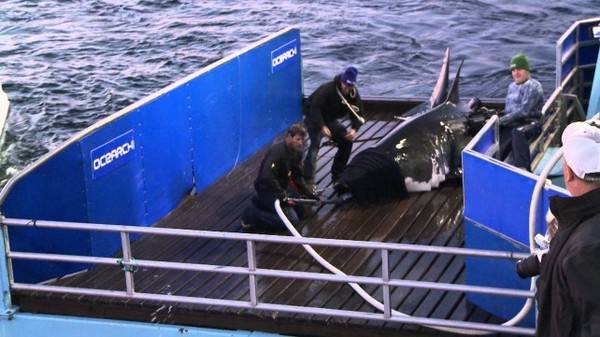 Кога ќе ја качат на палубата, научниците и ги врзуваат очите и ја полната нејзниата уста со вода за да ја смират.
