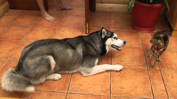 Меѓутоа не секогаш е тоа така. Во видеото мачката одбива да игра со веселата и дружељубива хаска. Колку и да моли и плаче доброто кутре, итрицата од страв не ни помислува да му врати со добра игра на кутрето.