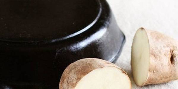 Пресечете еден компир на половина. Пресечената страна намачкајте ја со сода бикарбона и со него тријте ја ‘рѓосанта површина од тавата. Ако по некое време компирот почне да лизга, пресечете тенок дел и на чистиот остаток повторно налепете сода бикарбона. Продолжете со триење додека да се одстрани целата ‘рѓа. Потоа едноставно исплакнете ја тавата со чиста вода и можете да ја употребувате за готвење.