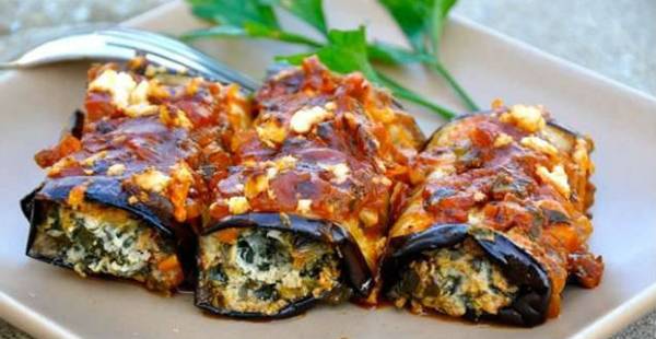 Исушете го модриот патлиџан, па на секоја кришка ставете од подготвената смеса и малку сос од патлиџан.