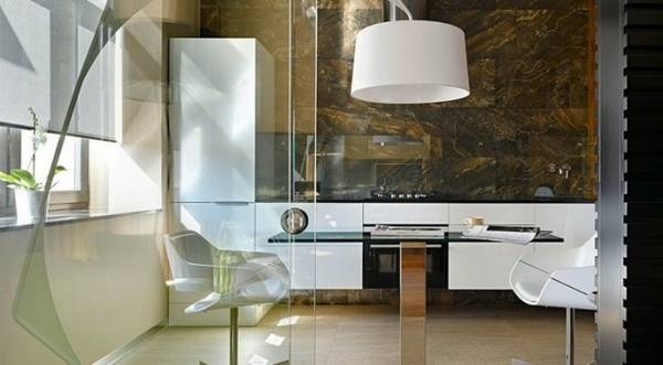 За вака мал стан кујната е потенцирана со несразмерна големина према останатите области, па така во неа има место и за трпезариска маса за две лица.