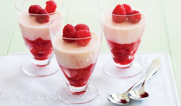 4. Во стаклени садови за сервирање ставете малку смеса од слатката павлака, прелијте со фил од малини, и истата постапка повторете ја уште еднаш.
