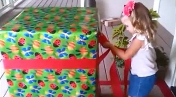 Ова девојче не ни можела да замисли што се наоѓа во огромната кутија која е обвитканана со украсна хартија.