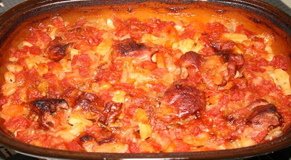 Кога е до пола варено, префрлете ја смесата во земјена тава, добро распоредете ја, по потреба додадете вода и на крај ставете 500 мл домати пелати од конзерва.