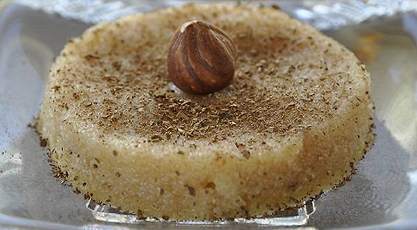 Во големо тавче ставете ги маслото и гризот. Со постојано мешање, гответе го гризот додека да добие златно-кафена боја. Додадете ги бадемите и промешајте ги, за да се тостираат малку. Шеќерот измешајте го со водата и мешајте додека да се растопи. Полека, додавајте од сирупот во смесата со гриз. Мешајте и продолжете да готвите се додека целиот сируп не биде апсорбиран од гризот. Кога сето ќе се згусне, ставете го во друг сад и оставете да се олади сосема. Сервирајте ладно со малку цимет.