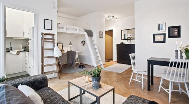Во овој стан креветот за спиење е над подот па така не завзема површина, а под него е поставена маса за работен простор. Таков распоред овозможува добивање простор за дневна соба, па дури и трпезарија.