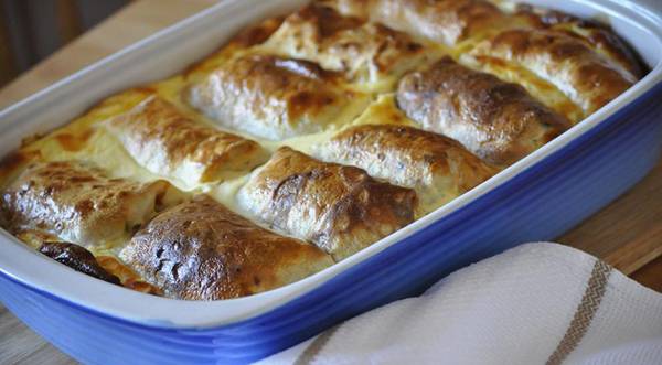 На малку масло додадете го ситно исецканиот кромид и кога ќе пушти мирис додадете ја ситно исецканата пиперка. Кога пиперката ќе омекне додадете го месото и пржете на тивок оган со постојано мешање. По 5 минути додадете ги сецканите печурки. Додадете ги и зачините и пржете на тивок оган се додека целата течност не испари. Смесата изладете ја и полнете ги палачинките. Ставете ги во ватростален сад и полиете ги со преливот кој сте го подготвиле така што сте ги измешале јајцата, палвлаката за готвење, јогуртот и мелкото. Ставете ги во загреана рерна на 200 степени и печете околу 30-40 минути.