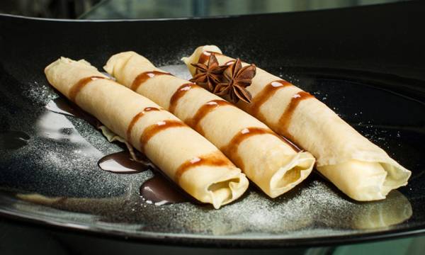 4. Ставете фил на палачинките, испрскајте ги со стопено чоколадо и украсете со листови нане.
