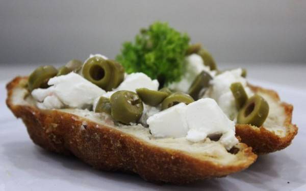Фета сирењето исцедете го, додадете ги исецканите маслинки, посипете со оригано, обилно залејте со маслиново масло. Послужете.