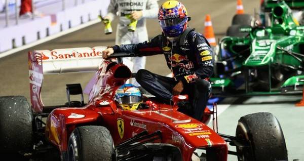 Марк Вебер поради дефект на болидот не успеа да го извози последниот круг од неделната трка. Алонсо го забележал пријателот на стазата и одлучил да го однесе до гаражата.