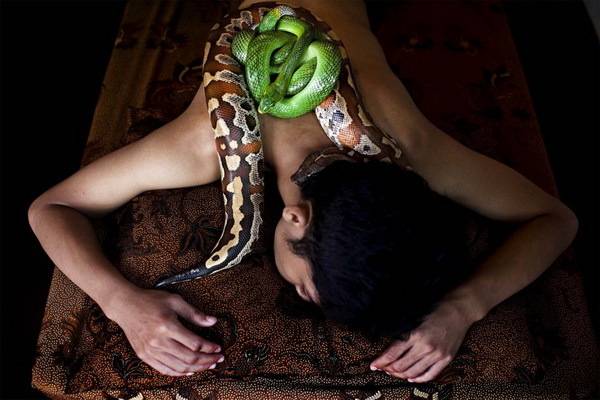 Индонезискиот питон се користи во масажа, каде целото тело прекриено со змии ги масираат сите мускули.