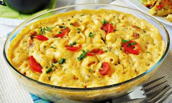 Потоа тргнете од рингла, додадете ги тестенините, јајцата, моцарелата, пармезанот и босилекот по вкус. Полека измешајте. Плехот намачкајте го со масло и во него ставете ја подготвената тестенина. Ставете во загреана рерна на 180 степени да се запече.