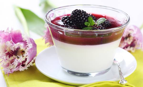Потребно е: 1/2 шолја слатка павлака, 1/2 шолја полномасно млеко, 1 пакување желатин, 1/2 шолја шеќер, 350 мл грчки јогурт, 1 1/3 шолја капини, 1/4 шолја вода, 3 лажици мед, прстофат сол, 1/2 лажички кора од портокал.