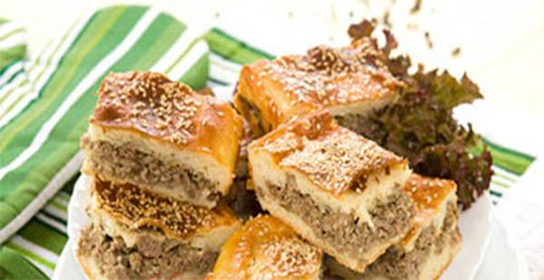 Тестото поделете го на два дела и од секој дек расукајте правоаголна кора со дебелина од 4 мм. Првата кора добро распоредете ја на намрсена правоаголна тава за печење, па прекријте ја со друата кора. Питата посипете ја со сусам и печете ја во загреана рерна на температура од 220 степени околу 20тина минути. Добар апетит!